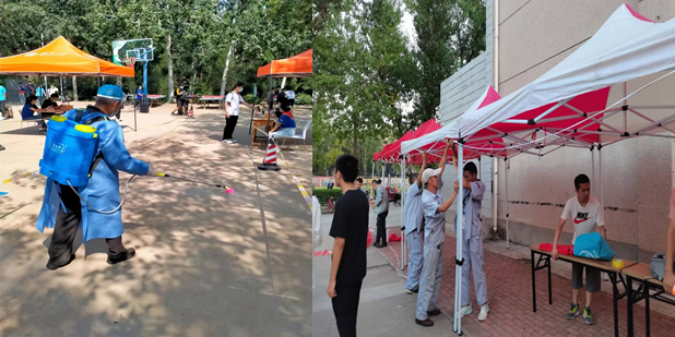 2. 场地布置及疫情防控方面:提前与学生工作处对接场地布置,安排各物业服务单位加班完成迎新帐篷内的电源线、插座及照明设备的安装工作。新生报到当天对学校门口、体检点等重点区域进行彻底消杀,并每隔两小时强化一次。