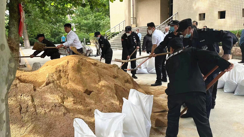 本次演练场景模拟第二教学楼地下室因暴雨进水,防汛应急救援队接到汛情抢险通知,立即组织40余名救援队员携带维修设备、铁锨、沙袋、运输车辆等赶至现场,快速装填、运输,码放沙袋封堵进水口,同时安排抢险队员进入地下室检查积水、电路、室内设施等情况。在演练过程中,全体队员密切配合,协力作战,经过30分钟的模拟实战,顺利完成演练任务。